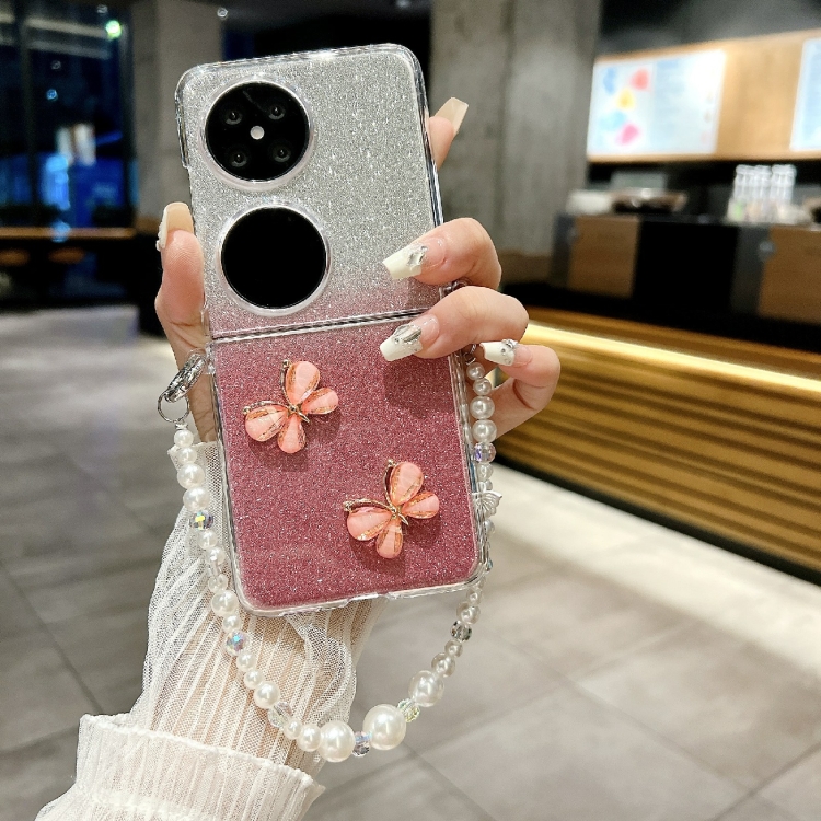 Funda para Huawei P50 Pocket Glitter Powder 3D Butterfly PC Hebilla Lateral Cobertura Total con Pulsera de Perlas (Rojo)