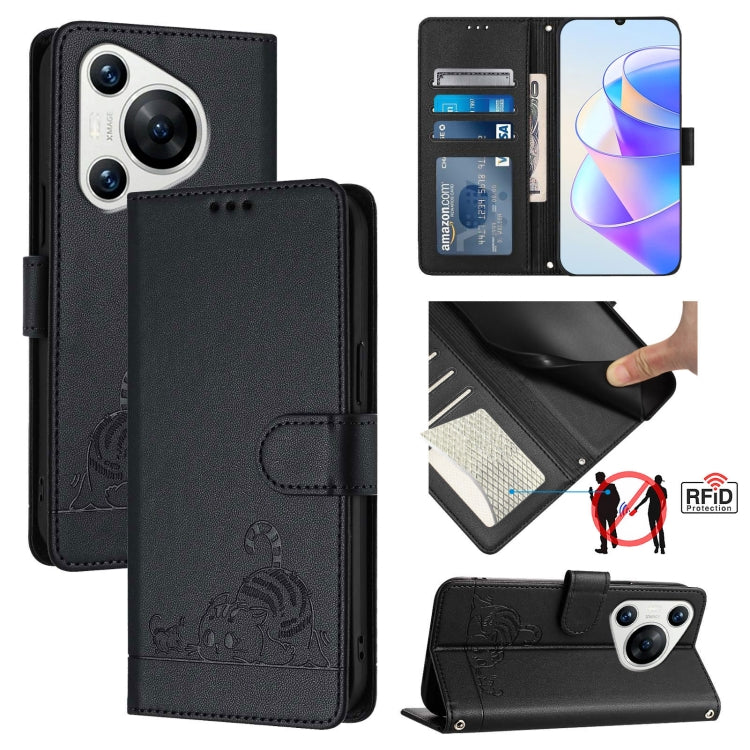 Funda para Huawei Pura 70 Cat Rat de Cuero Rfid con Patrón en Relieve y Cordón (Negro)