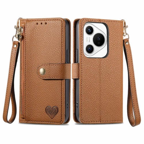 Funda de Cuero para Huawei Pura 70 Love con Zipper y Lanyard (Marrón)