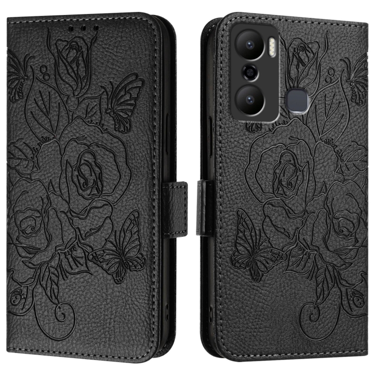Funda de Cuero Antirrobo RFID para Infinix Hot 20 Play con Relieve de Rosa (Negro)