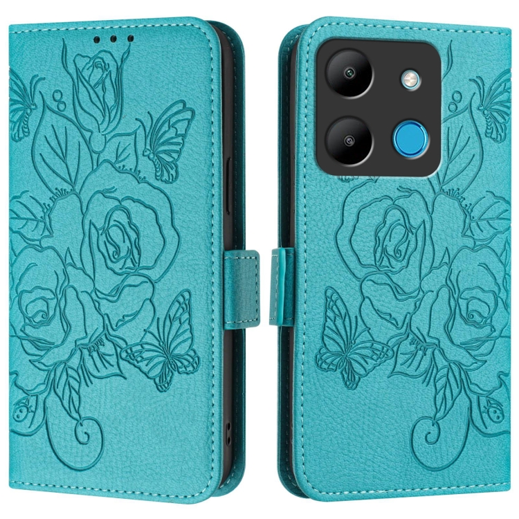 Funda de Cuero Antirrobo RFID para Infinix Smart 7 con Rosa en Relieve (Azul Claro)