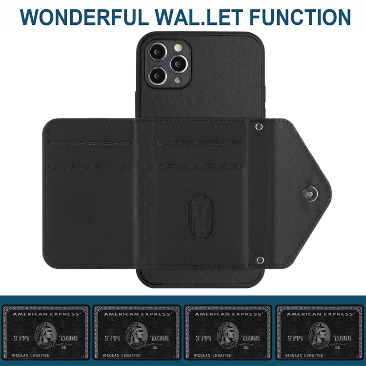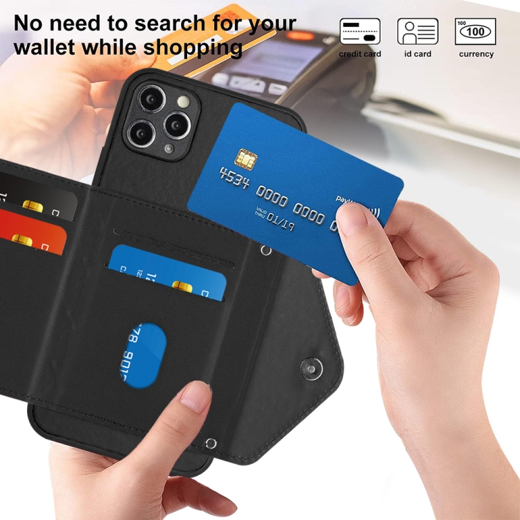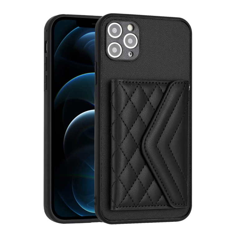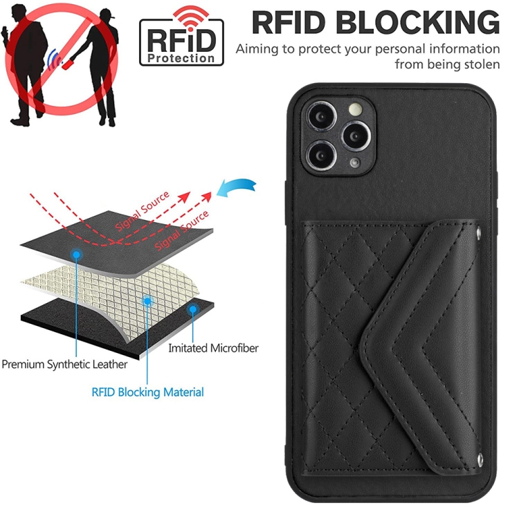 Estuche para Teléfono iPhone 11 Pro Max Rfid con Bolsa para Tarjetas Textura Rómbica y Cordón Largo (Negro)