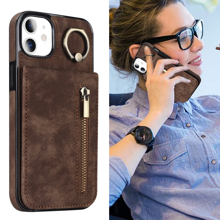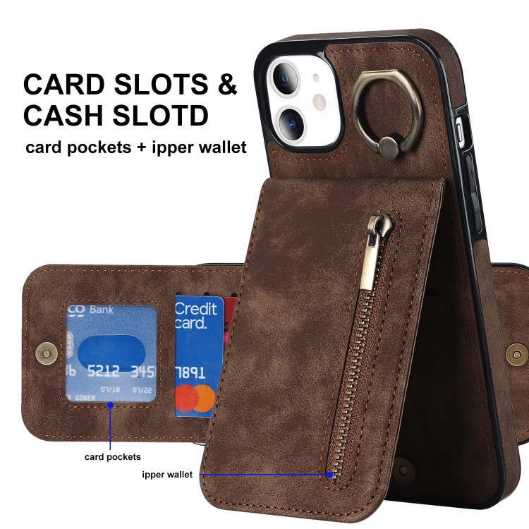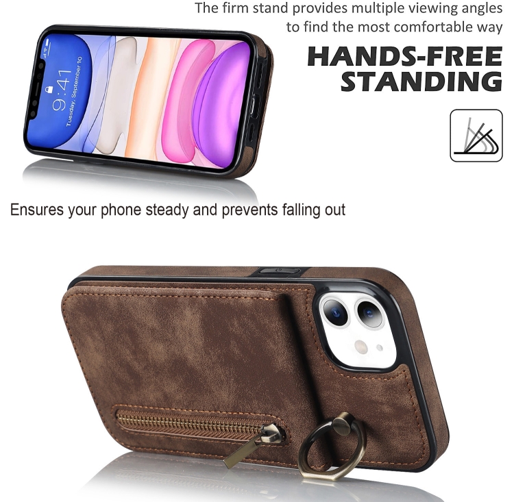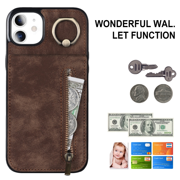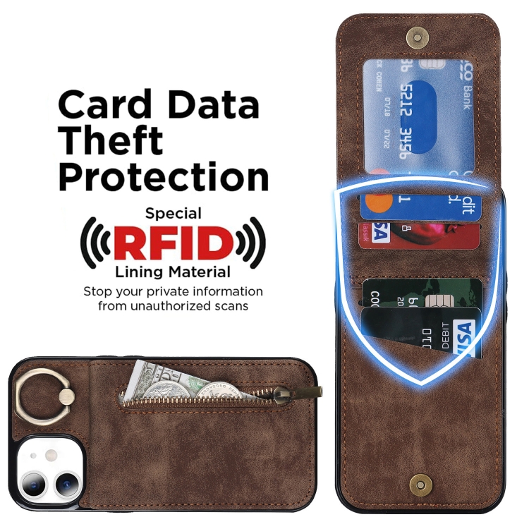 Funda para iPhone 11 Retro Ring y Zipper Rfid Card Slot (Marrón)