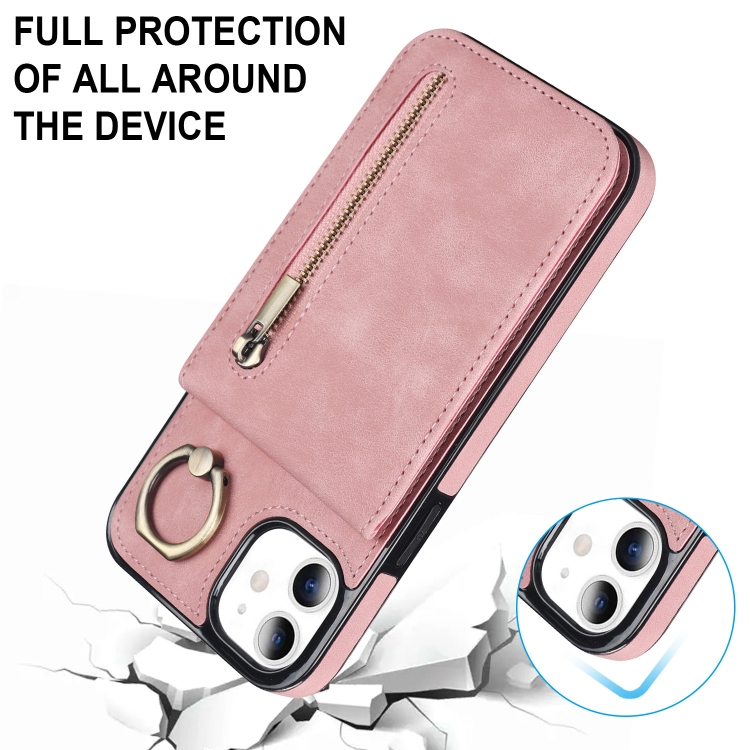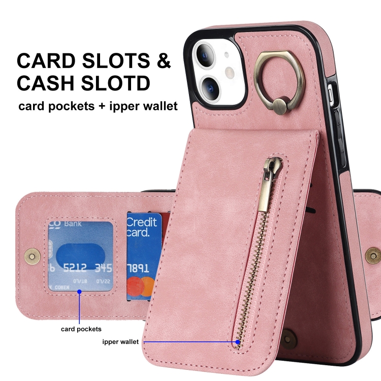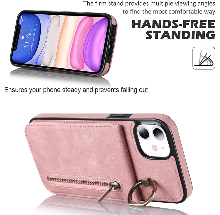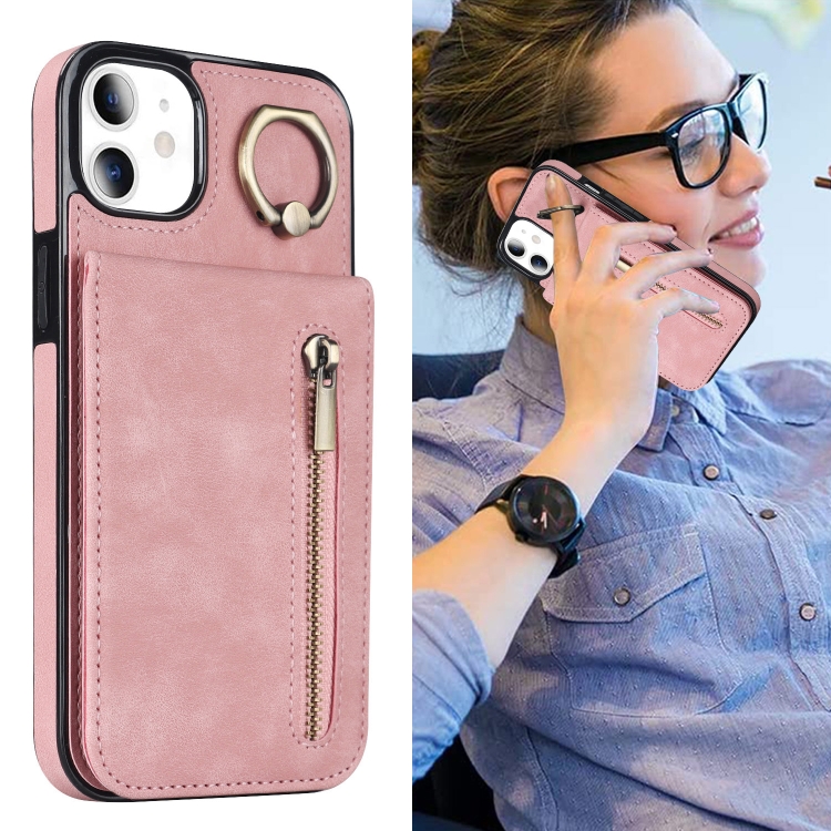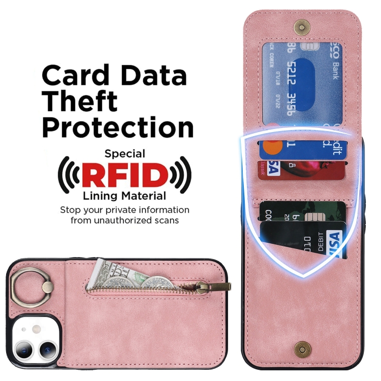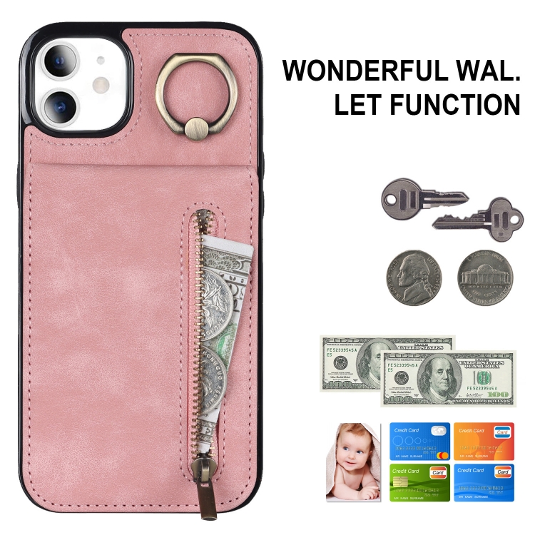 Funda para iPhone 11 Retro Ring y Zipper Rfid Card Slot (Rosa)