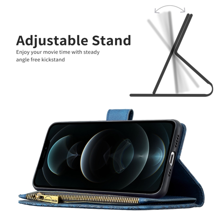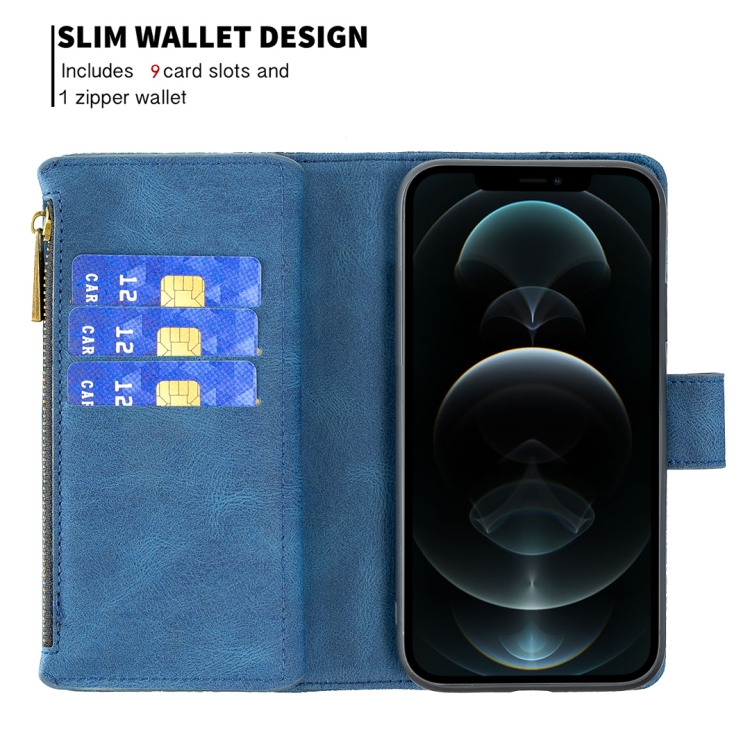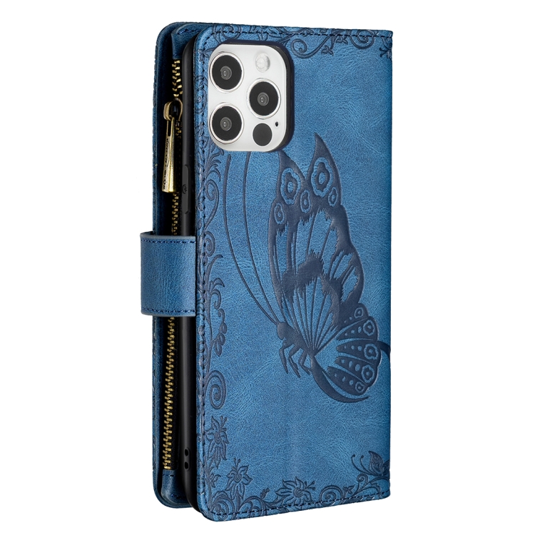 Funda de Cuero Flip para iPhone 12 Flying Butterfly con Cremallera Soporte y Billetera (Azul)