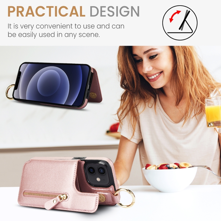 Funda para Teléfono iPhone 12 con Bolsa para Tarjetas Doble Hebilla y Cremallera (Oro Rosa)