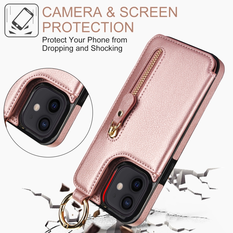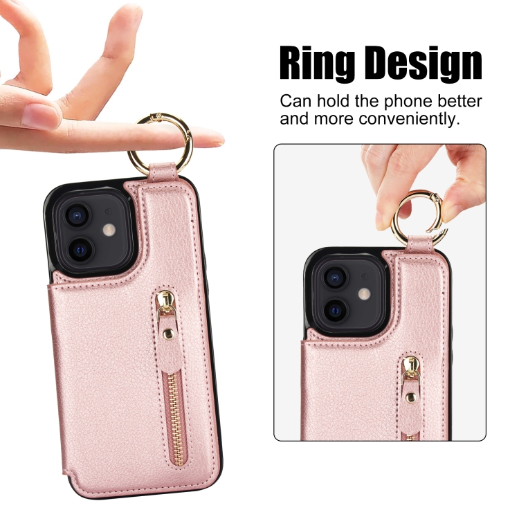 Funda para Teléfono iPhone 12 Mini Bolsa para Tarjetas Doble Hebilla Cremallera Textura de Litchi (Oro Rosa)