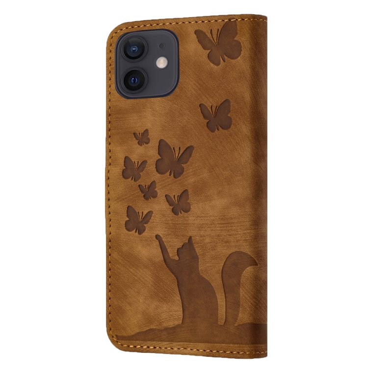Funda para Teléfono iPhone 12 Mini Cuero con Tapa En Relieve Butterfly Cat (Marrón)