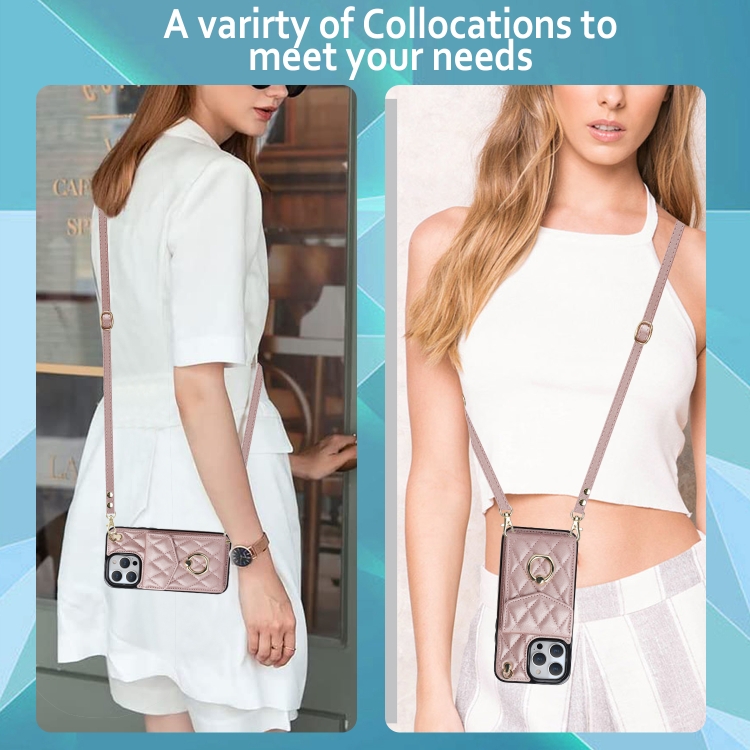 Funda para Teléfono iPhone 12 Pro Max Rhombic Texture Card Bag con Cordón Largo (Oro Rosa)