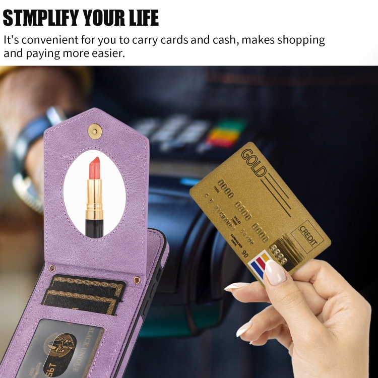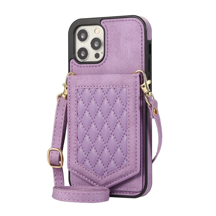 Funda para iPhone 12 Pro Max Rhombic Texture Rfid con Cordón y Espejo (Púrpura)