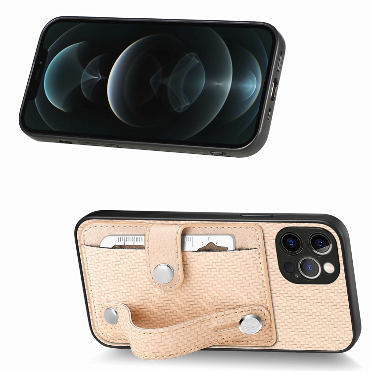 Funda para iPhone 12 Pro Max Wristband Kickstand Card Wallet con Tool Knife (Khaki)