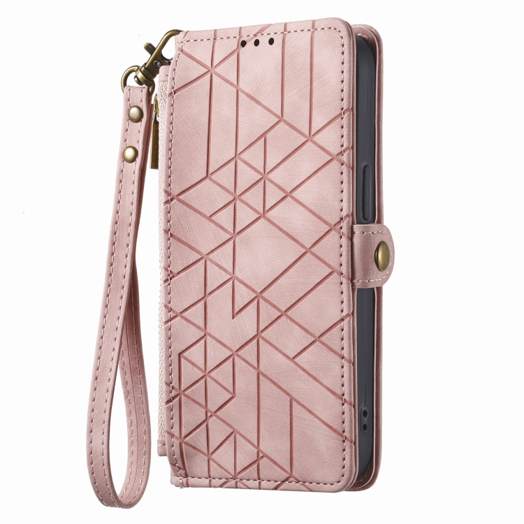 Funda de Cuero para iPhone 13 Cartera con Cremallera Geométrica y Hebilla Lateral (Rosa)