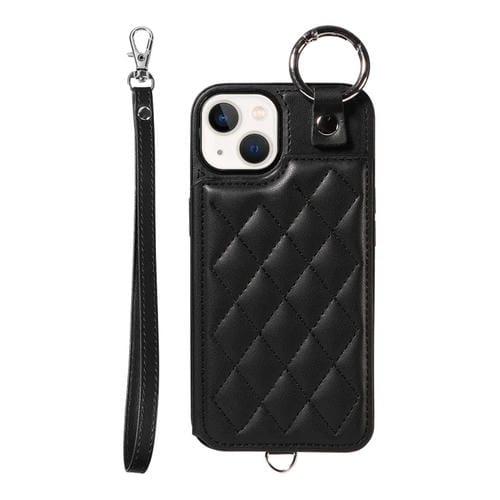Funda para teléfono iPhone 13 con bolsa para tarjetas textura rómbica y cordón corto (Negro)