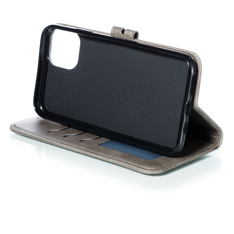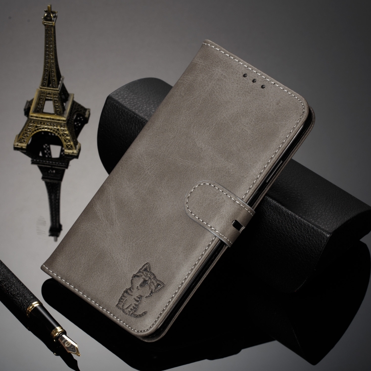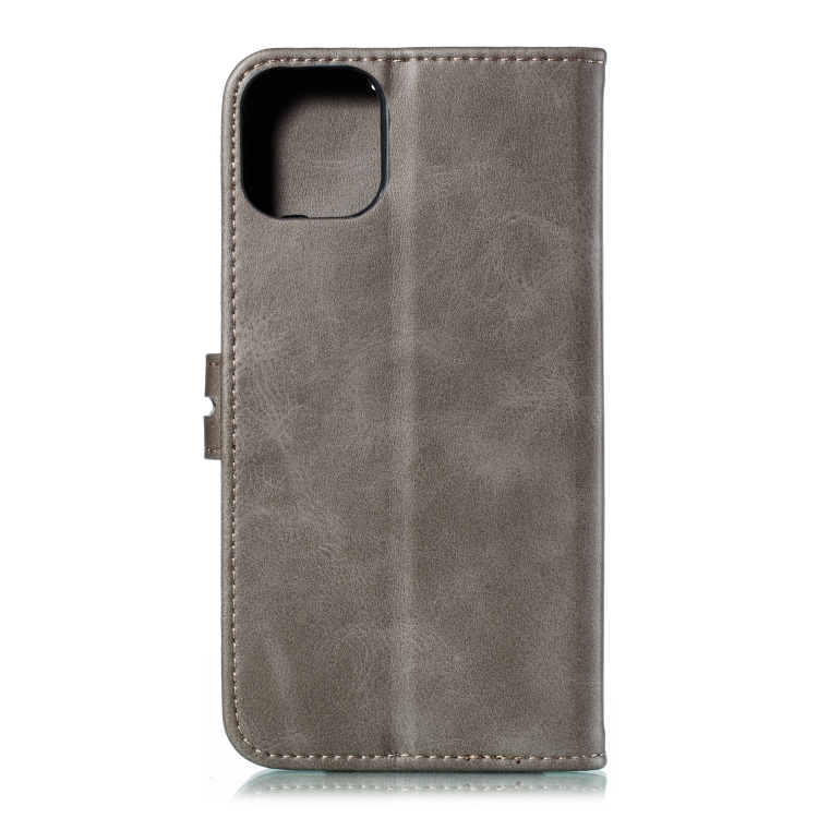 Estuche de Cuero para iPhone 13 Mini Volteo Horizontal Patrón Gato Feliz con Soporte y Ranuras para Tarjetas y Billetera (Gris)