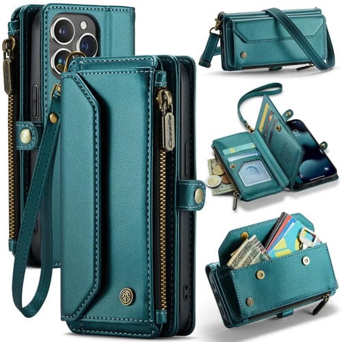 Estuche para teléfono Caseme C36 para iPhone 13 Pro Max con ranuras para tarjetas cartera con cremallera antirrobo Rfid (Azul-Verde)