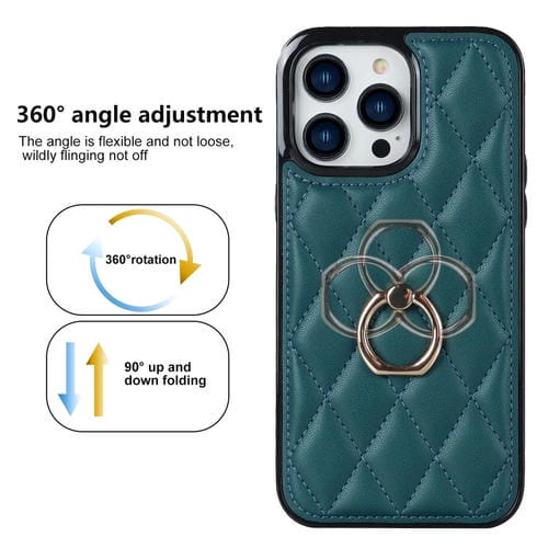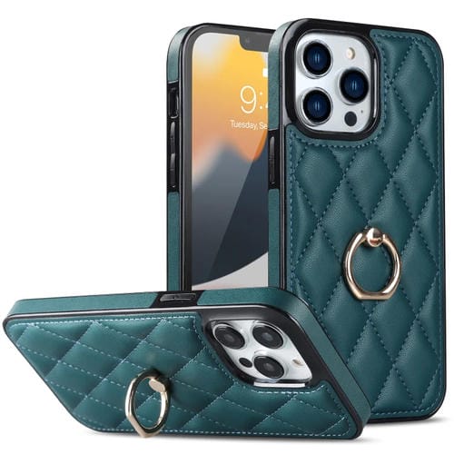 Funda para iPhone 13 Pro Max Rhombic PU Cuero con Soporte para Anillo (Verde)
