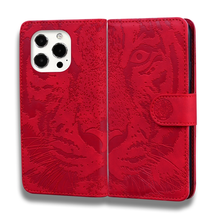 Funda de Cuero iPhone 13 Pro Tiger Embossing con Tapa Horizontal Soporte Ranuras Tarjetas Billetera (Rojo)