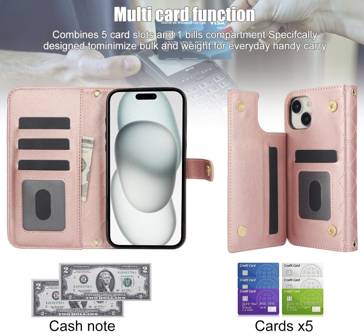 Estuche para Teléfono iPhone 14/13 Cuero Rómbico Multifunción Cruzado (Oro Rosa)