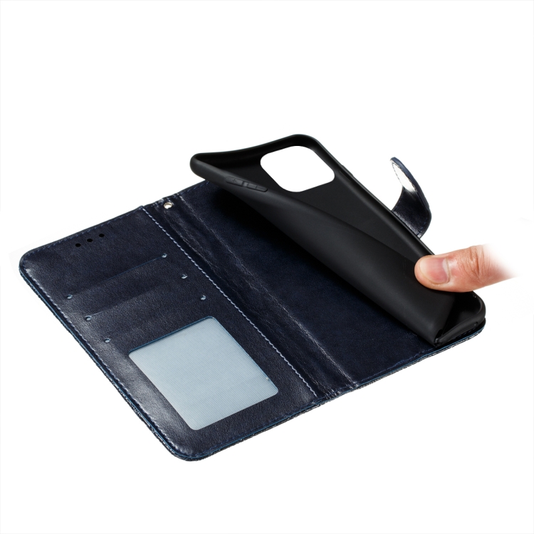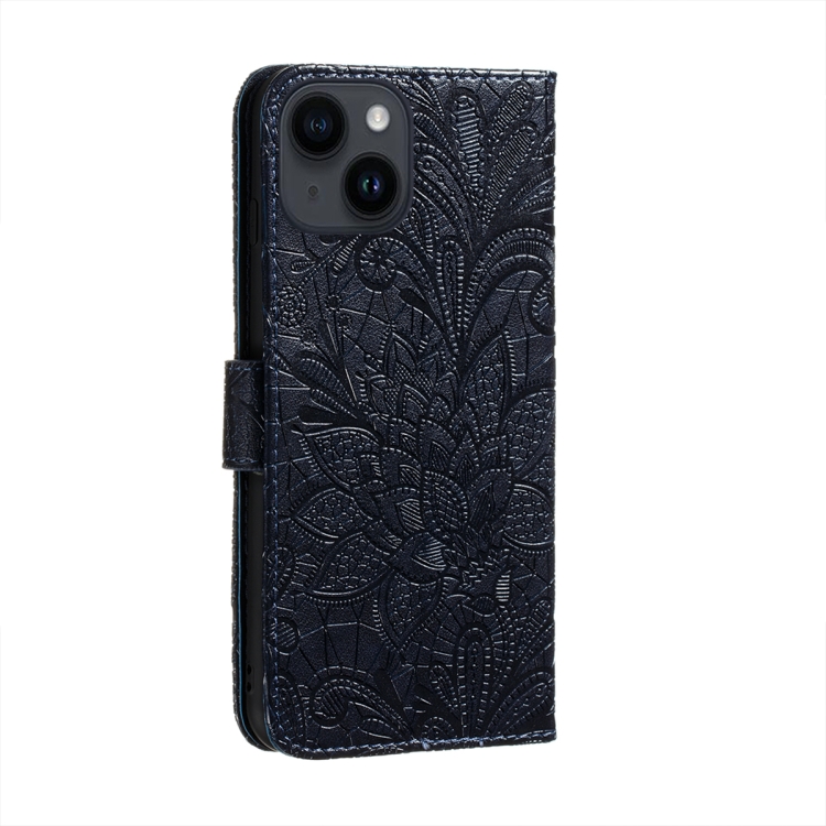 Funda de Teléfono para iPhone 14 y 13 con Tapa de Cuero y Estampado de Flores de Encaje (Azul Oscuro)