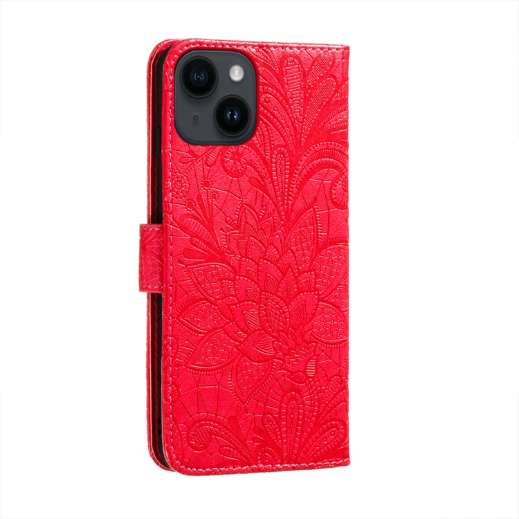 Funda de Teléfono iPhone 14 / 13 con Tapa de Cuero y Estampado de Flores de Encaje (Rojo)