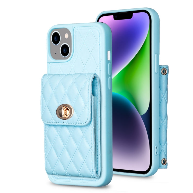 Pour iPhone 14 Portefeuille à boucle métallique verticale Étui de téléphone en cuir rhombique (Bleu)