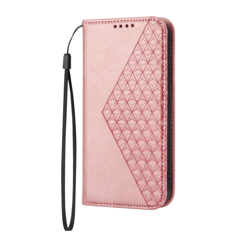 Funda para iPhone 14 Cubic Grid Becerro Textura Cierre Magnético Cuero (Oro Rosa)