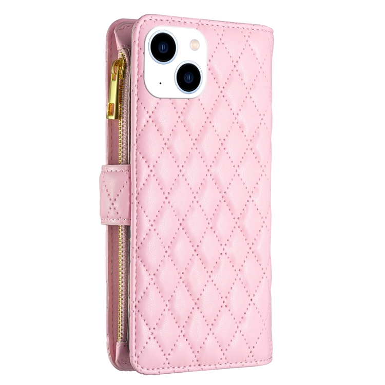 Funda para iPhone 14 Diamond Lattice Zipper Wallet de Cuero con Tapa (Rosa)