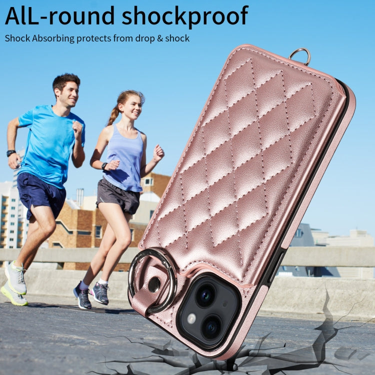 Estuche para Teléfono iPhone 14 con Bolsa para Tarjetas Textura Rómbica y Cordón Corto (Oro Rosa)