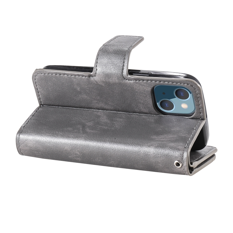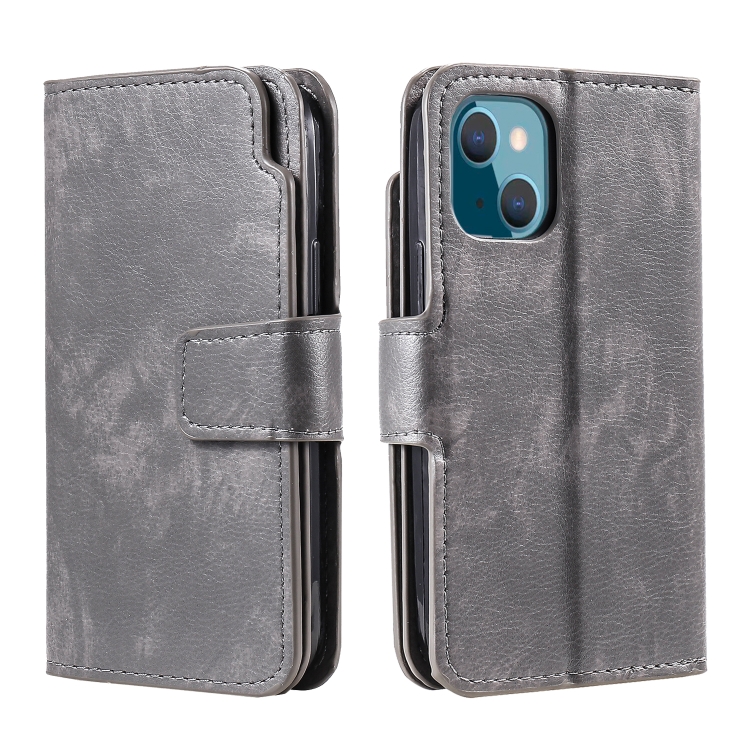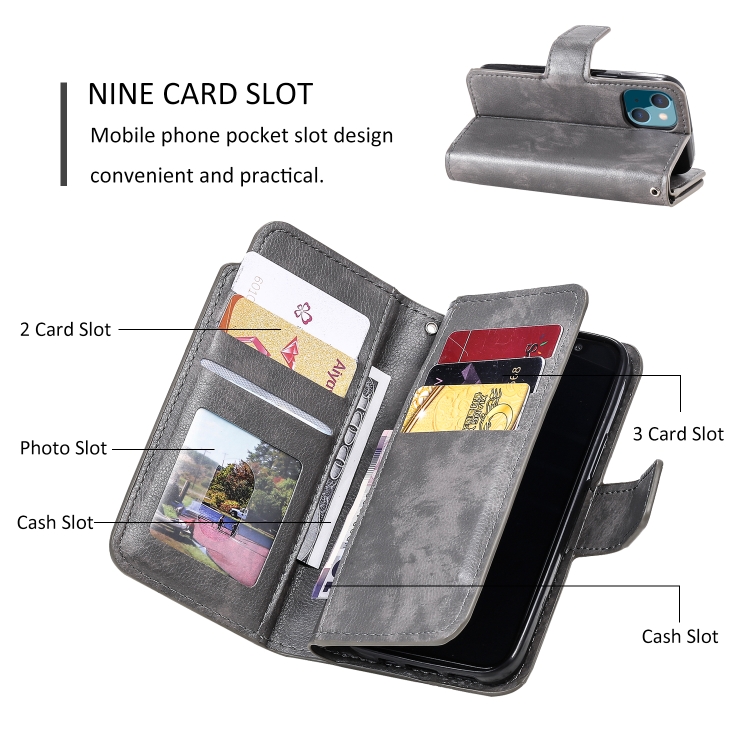 Funda de Cuero para Teléfono iPhone 14 Litchi Texture 9 Card Tri-Fold (Gris)