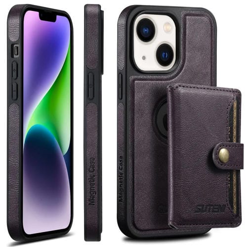 Pour iPhone 14 Plus Suteni M1 Étui de téléphone MagSafe en cire d'huile avec pochette pour carte horizontale détachable (violet)