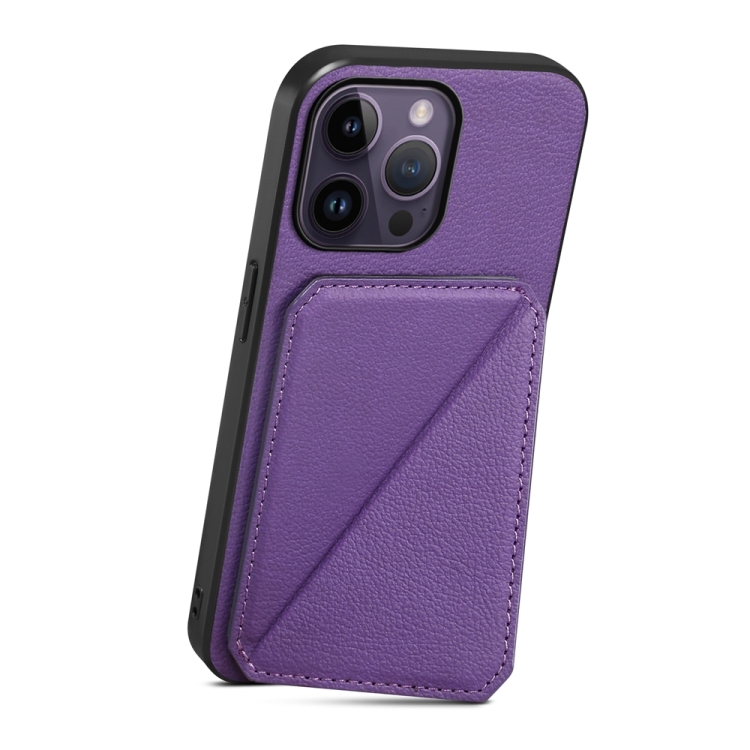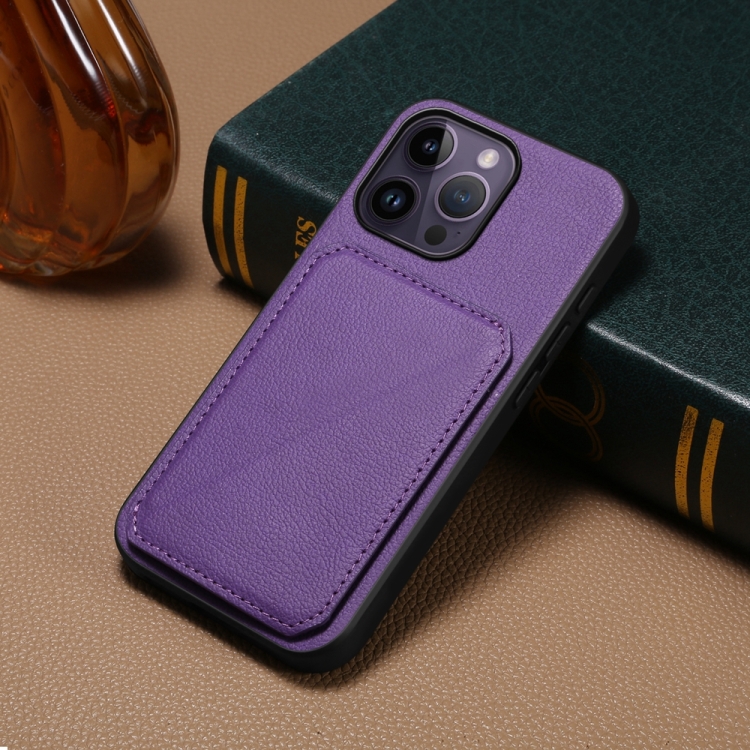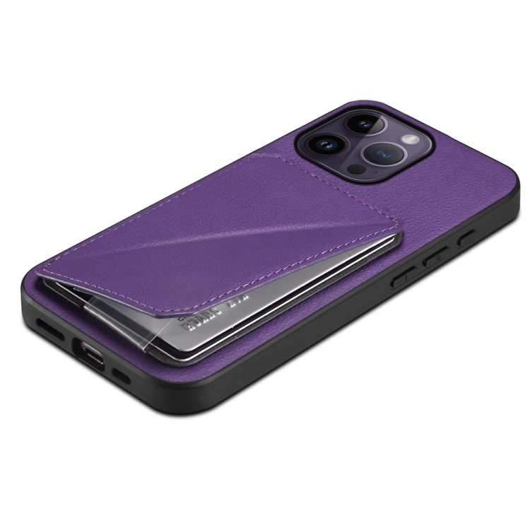 Funda para Teléfono iPhone 14 Pro Max D04 Soporte Ranura para Tarjeta Dual Textura de Pantorrilla (Púrpura)