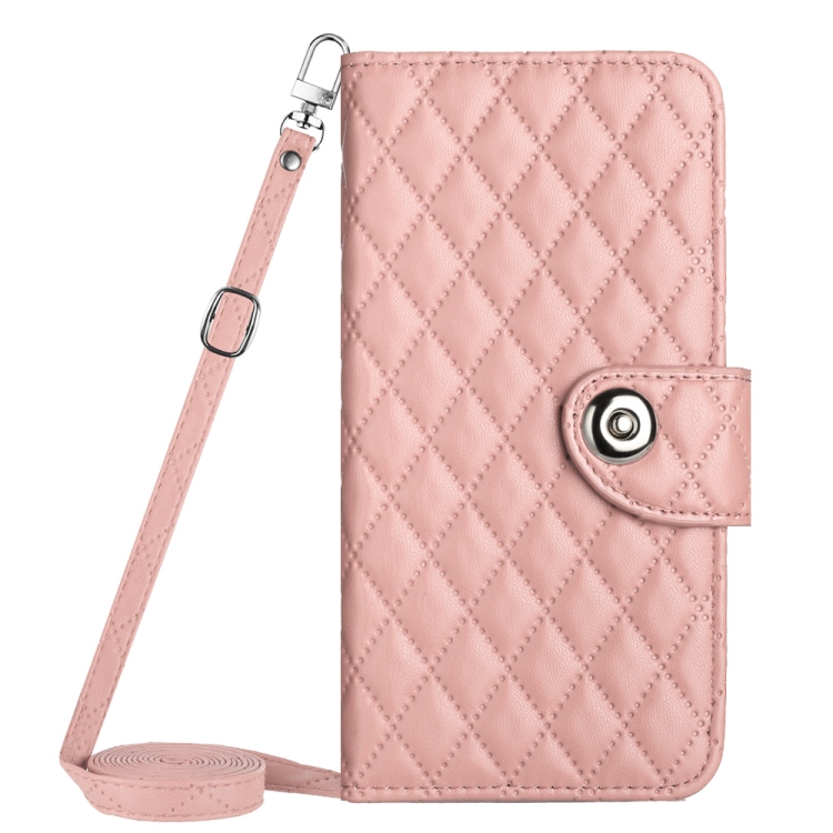 Funda para Teléfono iPhone 14 Pro Max con Tapa de Cuero Textura Rómbica y Cordón Largo (Rosa Coral)