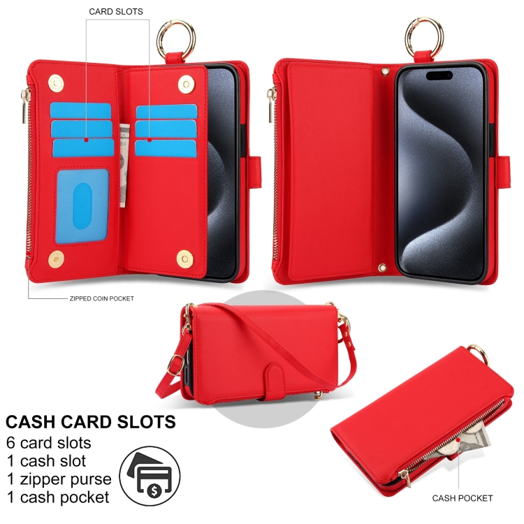 Funda para Teléfono iPhone 14 Pro Max Cuero Billetera Multifuncional Anillo Cruzado (Rojo)