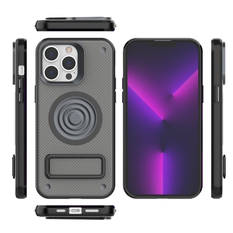 Funda para Teléfono iPhone 14 Pro Max PC + TPU Textura Fibra de Carbono Soporte de Metal (Gris)