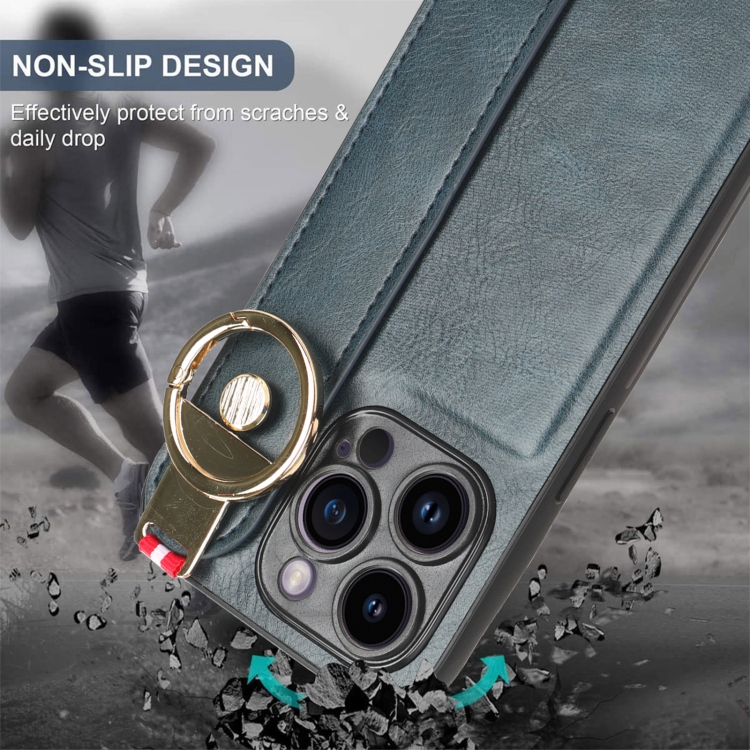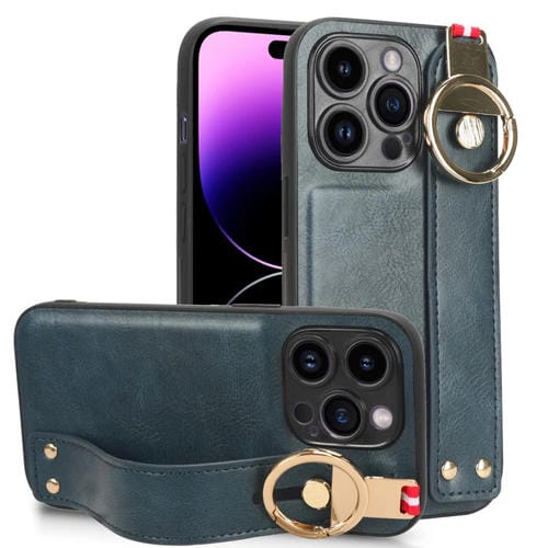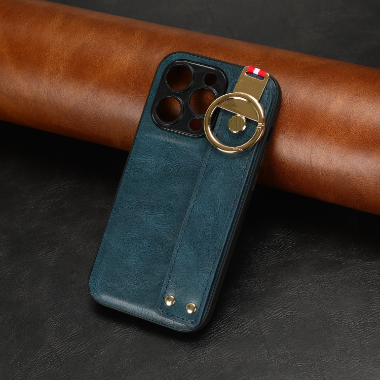 Funda Trasera de Cuero para iPhone 14 Pro con Muñequera (Azul)
