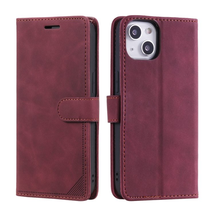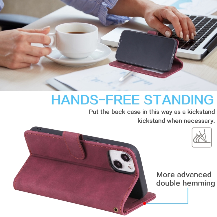 Funda de teléfono para iPhone 14 Skin Feel con tapa horizontal de cuero y cepillo antirrobo (Rojo)