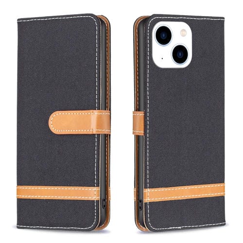 Pour iPhone 15 Color Block Denim Texture Étui de téléphone en cuir (Noir)