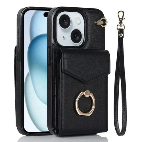 Pour iPhone 15 Étui de téléphone avec fente pour carte RFID avec support de bague (noir)