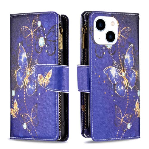 Pour iPhone 15 Étui de téléphone en cuir à fermeture éclair à motif de dessin coloré (papillon violet)