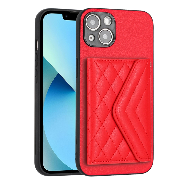 Estuche para teléfono iPhone 15 Plus con RFID bolsa para tarjetas textura rómbica cordón largo (Rojo)