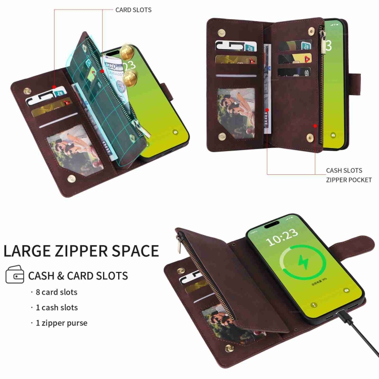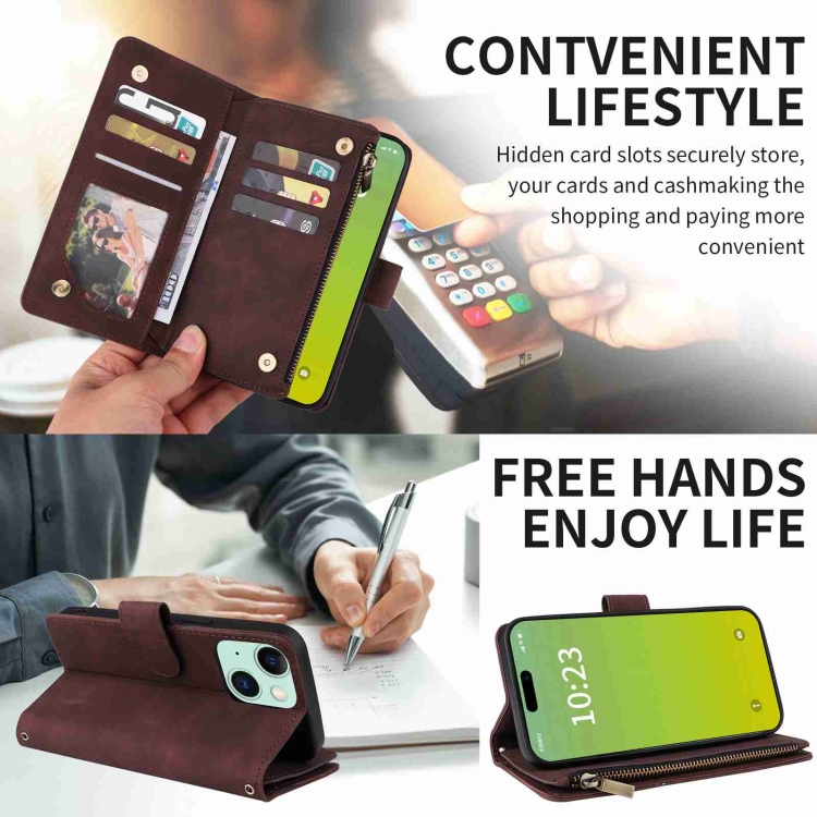 Funda Cruzada de Cuero para iPhone 15 Plus con Cremallera y Ranura para Tarjetas (Café)
