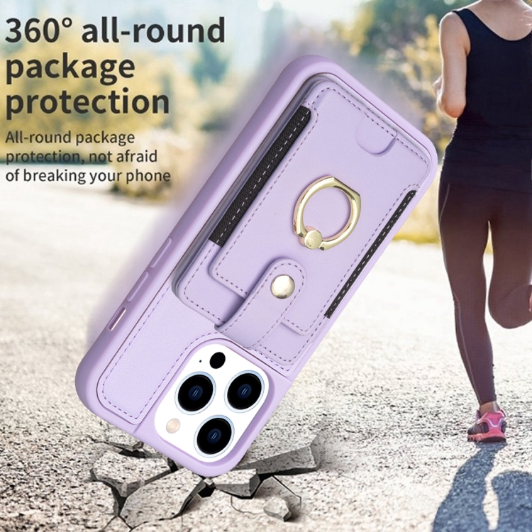 Funda para teléfono iPhone 15 Pro Bf27 con soporte para tarjeta y anillo de metal (Púrpura)