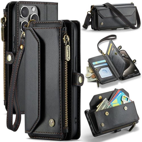 Estuche para teléfono Caseme C36 para iPhone 15 Pro con ranuras para tarjetas cartera con cremallera cuero antirrobo RFID (Negro)
