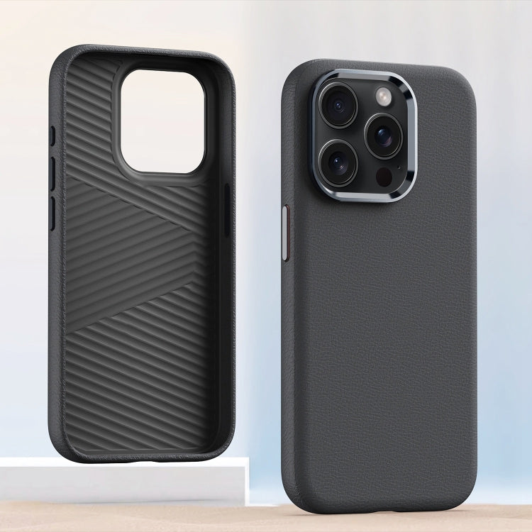 Estuche para teléfono iPhone 15 Pro Max a prueba de golpes de cuero con marco de Lente de metal (Gris)