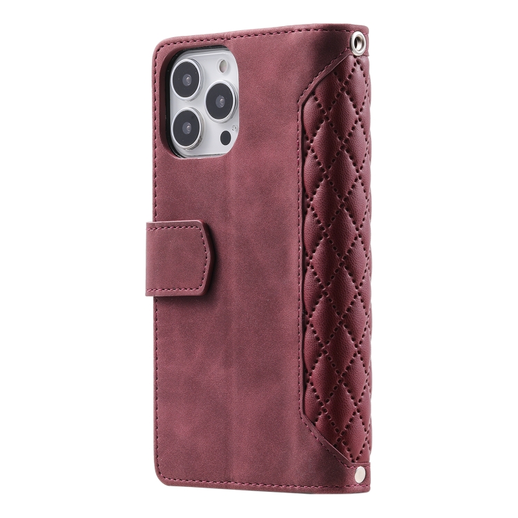 Funda de Cuero para iPhone 15 Pro Max Grid Texture con Cremallera y Cordón (Rojo Vino)