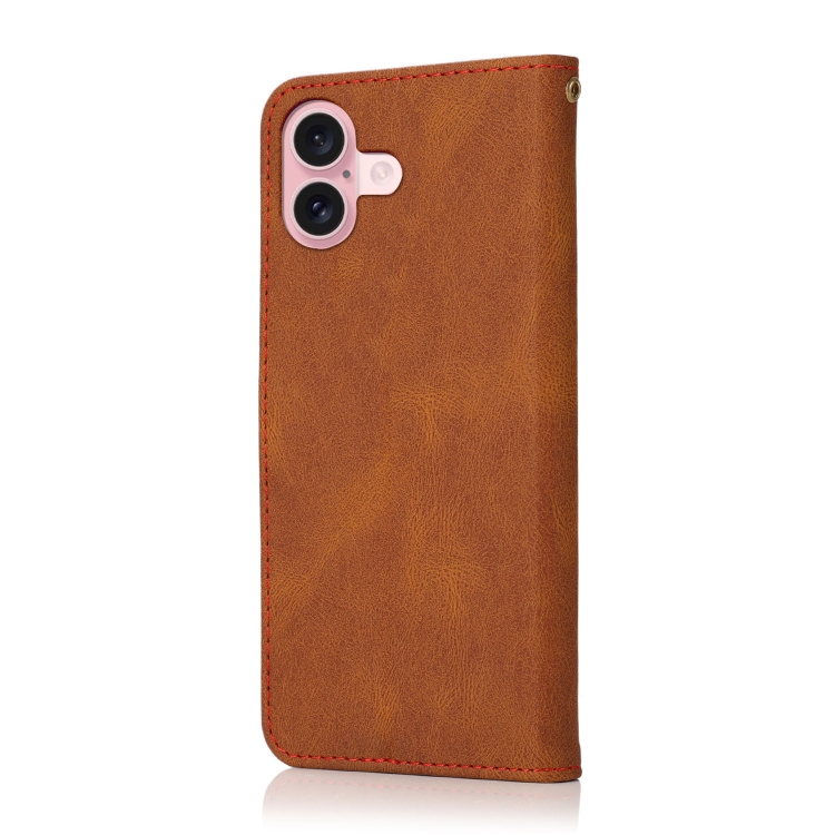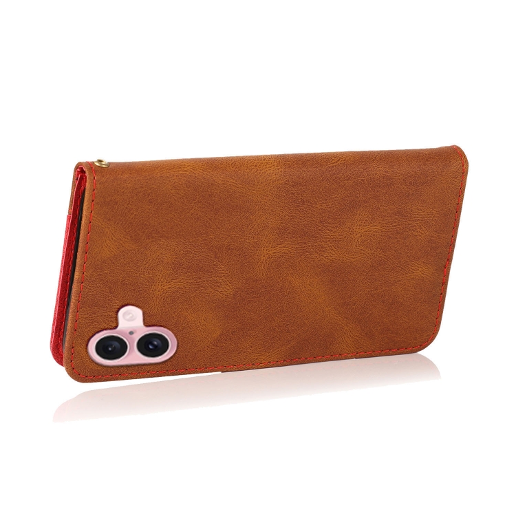 Funda de Cuero para iPhone 16 con Costuras de Dos Colores (Marrón Rojo)