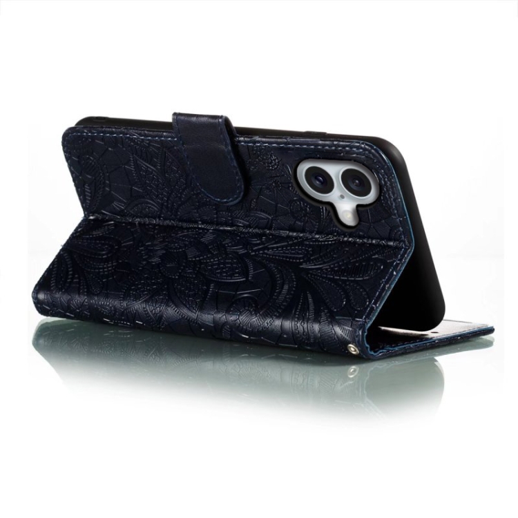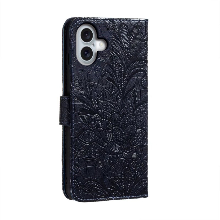 Funda de Cuero para iPhone 16 Plus con Tapa y Estampado de Flores de Encaje (Azul Oscuro)