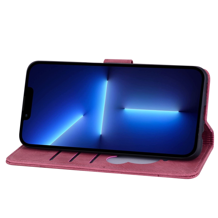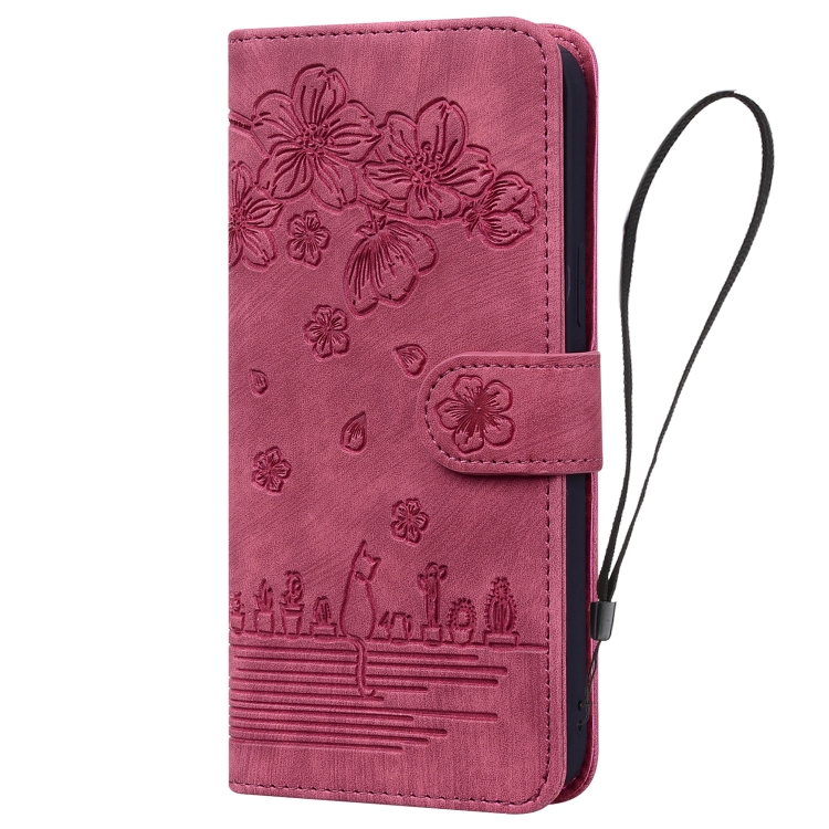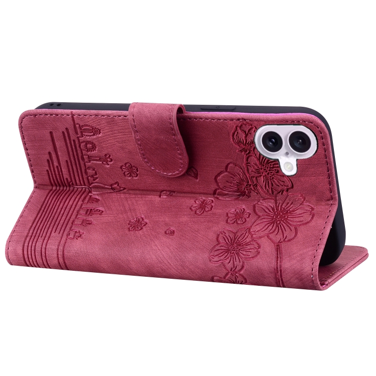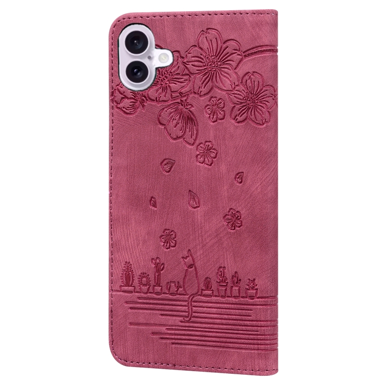 Funda para Teléfono iPhone 16 Plus Cuero Relieve Gato Sakura Dibujos Animados (Rojo Vino)