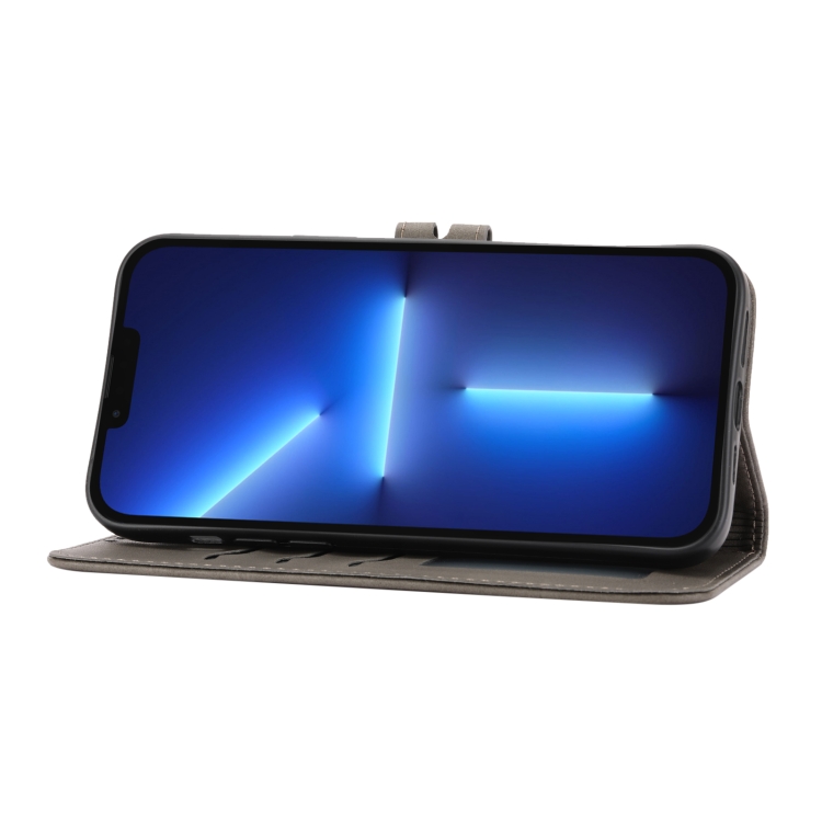 Funda para Teléfono iPhone 16 Pro Max Cuero con Tapa y Patrón de Gato Feliz en Relieve (Gris)
