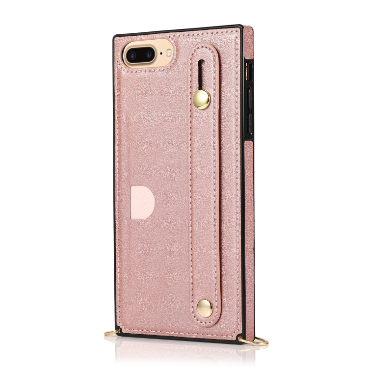 Funda para iPhone 8 Plus y 7 Plus con Correa de Muñeca Pu y TPU, Soporte, Ranura para Tarjeta (Oro Rosa)